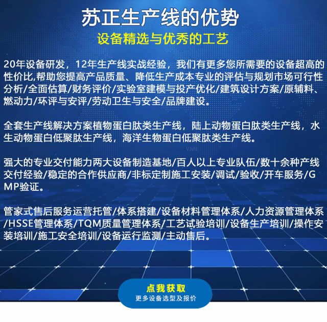 原料的質(zhì)量檢驗、原料的前處理、熱提工段、除油工段、生物酶解工段、過濾分離、脫色過濾、濃縮工段、殺菌工段,干燥工段,軟水處理,CIP清洗系統(tǒng)等。